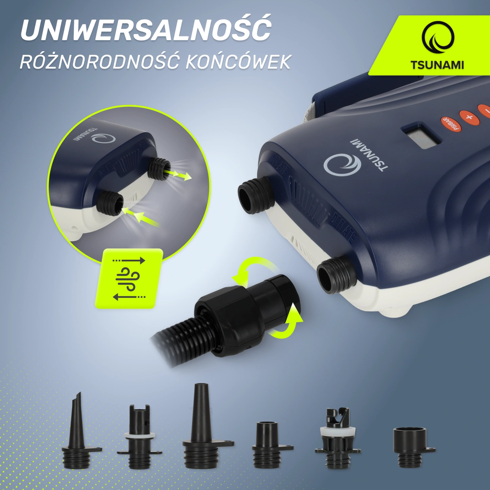 - Pompka elektryczna TSUNAMI służy do napełniania powietrzem m.in.: desek SUP, materaców, pontonów, piłek i innych dmuchanych akcesoriów plażowych.