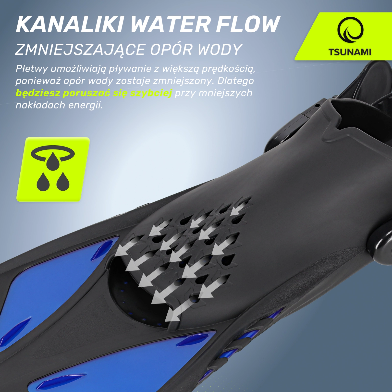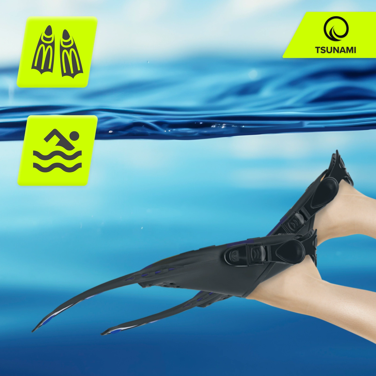 - Poczuj się jak ryba w wodzie, pływając szybciej i efektywniej. Nurkuj, uprawiaj snorkeling, i pracuj nad techniką. To wszystko dzięki regulowanym płetwom do pływania TSUNAMI, które w staną się najlepszym towarzyszem twoich wypraw nad wodę.