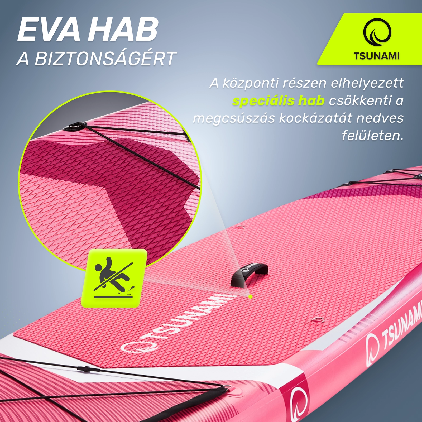 - Pianka EVA, którą deska SUP pokryta jest w środkowej części, i jej specjalnie wytłoczona diamentowa struktura zwiększają przyczepność i minimalizują ryzyko poślizgnięcia się na mokrej powierzchni.