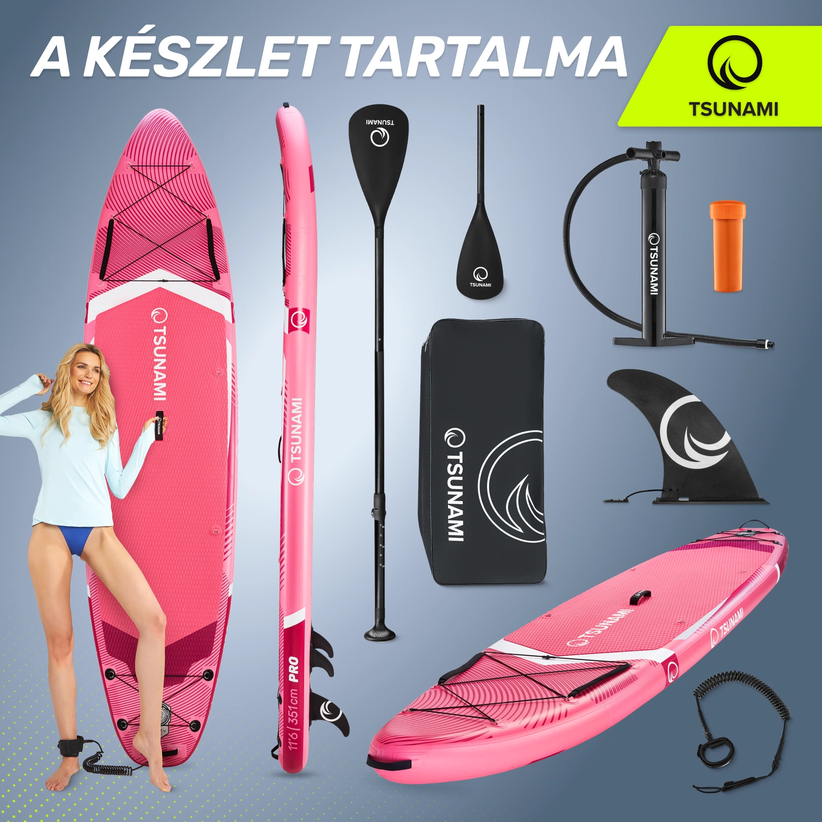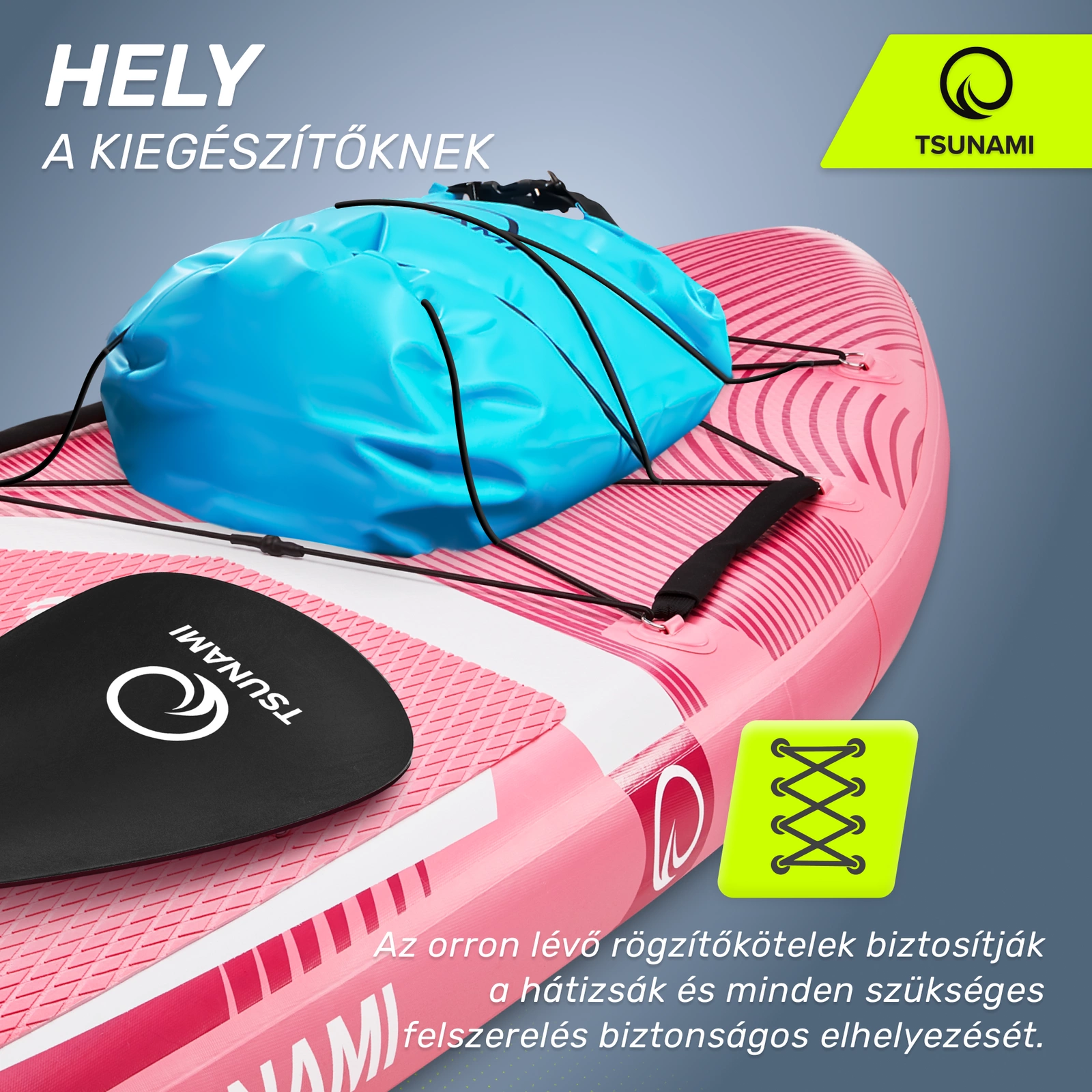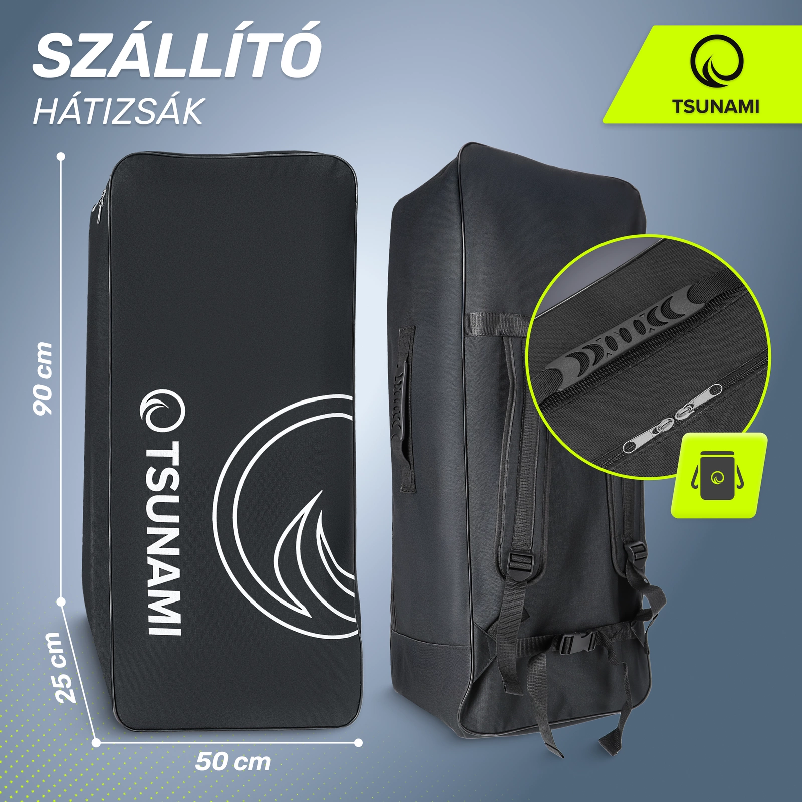 Co zawiera zestaw?Wybierając deskę do pływania SUP PRO TSUNAMI, w zestawie otrzymasz także plecak do transportu, pompkę, 3 stateczniki, linkę bezpieczeństwa z opaską na nogę, zestaw naprawczy, podwójne wiosło. Oznacza to, że przygodę z wiosłowaniem rozpoczniesz bez żadnych dodatkowych kosztów.