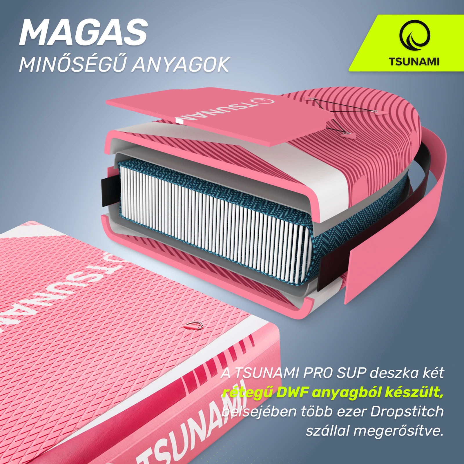 - Deska SUP PRO TSUNAMI została wykonana z dwuwarstwowego materiału DWF, który został wzmocniony wewnątrz tysiącami włókien Dropstitch. Dzięki temu charakteryzuje się ona zwiększoną odpornością na wahania temperatur oraz na uszkodzenia.