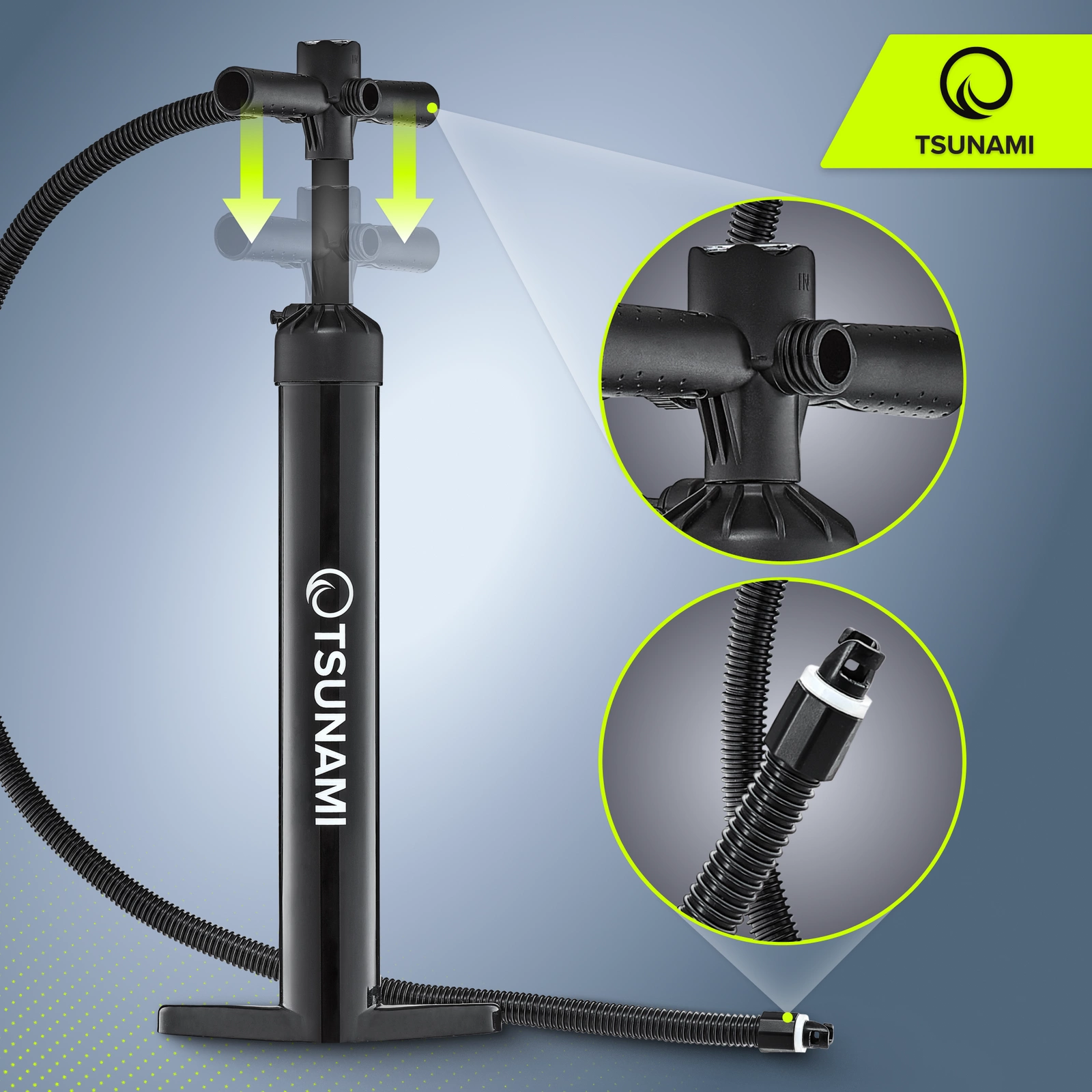 Deska do pływania SUP PRO TSUNAMIPompowana deska SUP TSUNAMI została wykonana z dwuwarstwowego materiału DWF, który został wzmocniony wewnątrz tysiącami włókien drop-stitch. Dzięki temu charakteryzuje się ona zwiększoną odpornością na wahania temperatur oraz na uszkodzenia.