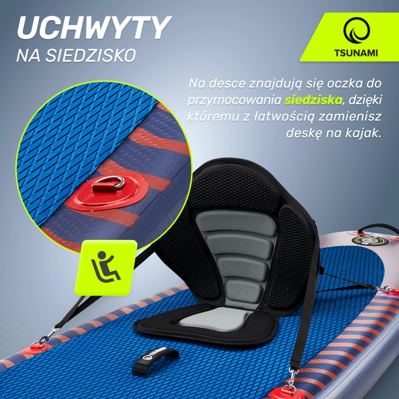 Deska do pływania SUP WAVE TSUNAMIPompowana deska SUP TSUNAMI została wykonana z dwuwarstwowego materiału DWF, który został wzmocniony wewnątrz tysiącami włókien drop-stitch. Dzięki temu charakteryzuje się ona zwiększoną odpornością na wahania temperatur oraz na uszkodzenia.