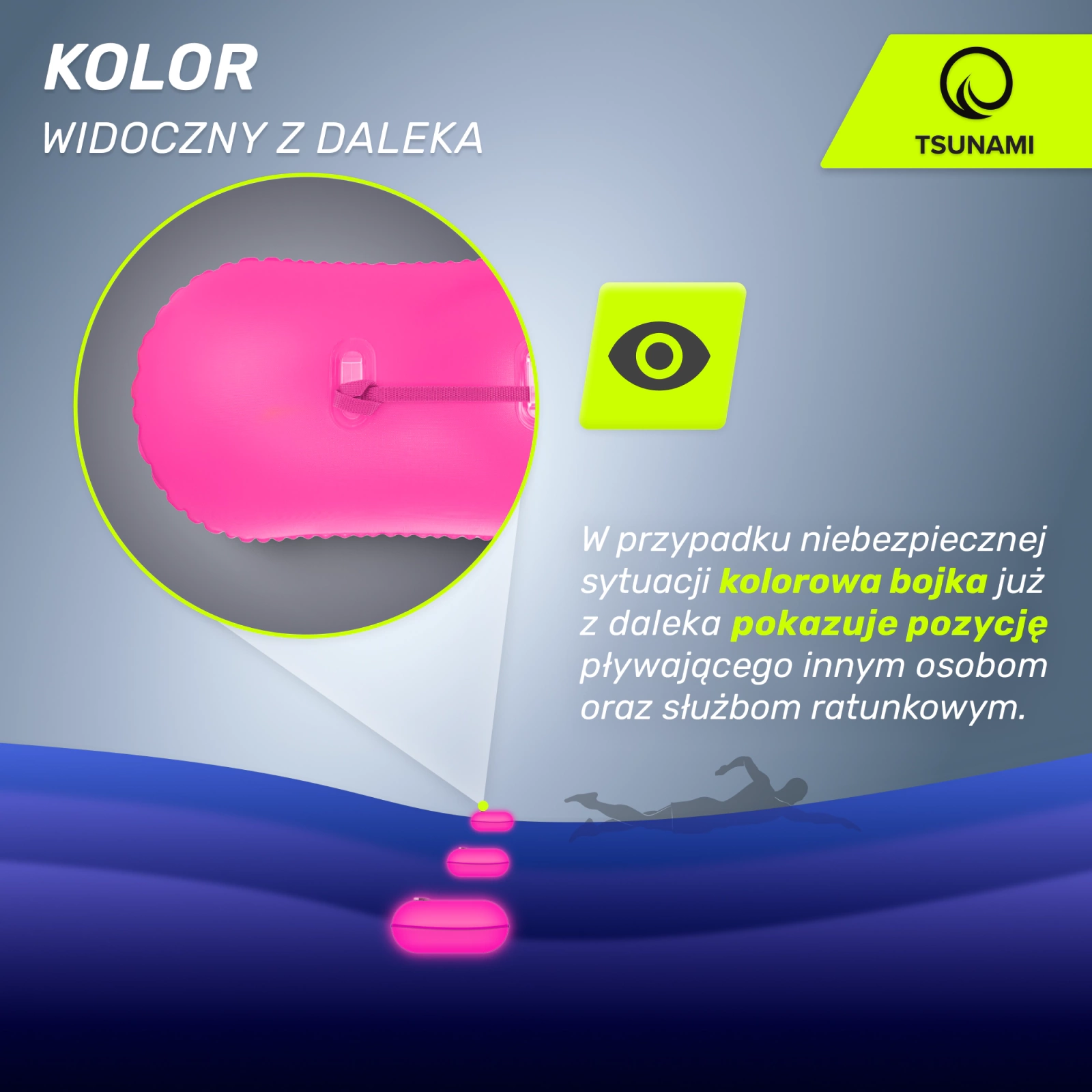 - Mocny, wyrazisty kolor bojki asekuracyjnej zapewnia doskonałą widoczność na wodzie. W razie niebezpieczeństwa boja pływacka wskazuje pozycję osoby pływającej innym użytkownikom oraz służbom ratunkowym.