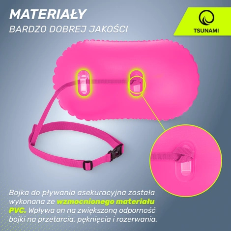 - Bojka do pływania asekuracyjna została wykonana ze wzmocnionego materiału PVC. Wpływa on na zwiększoną odporność bojki na przetarcia, pęknięcia i rozerwania.