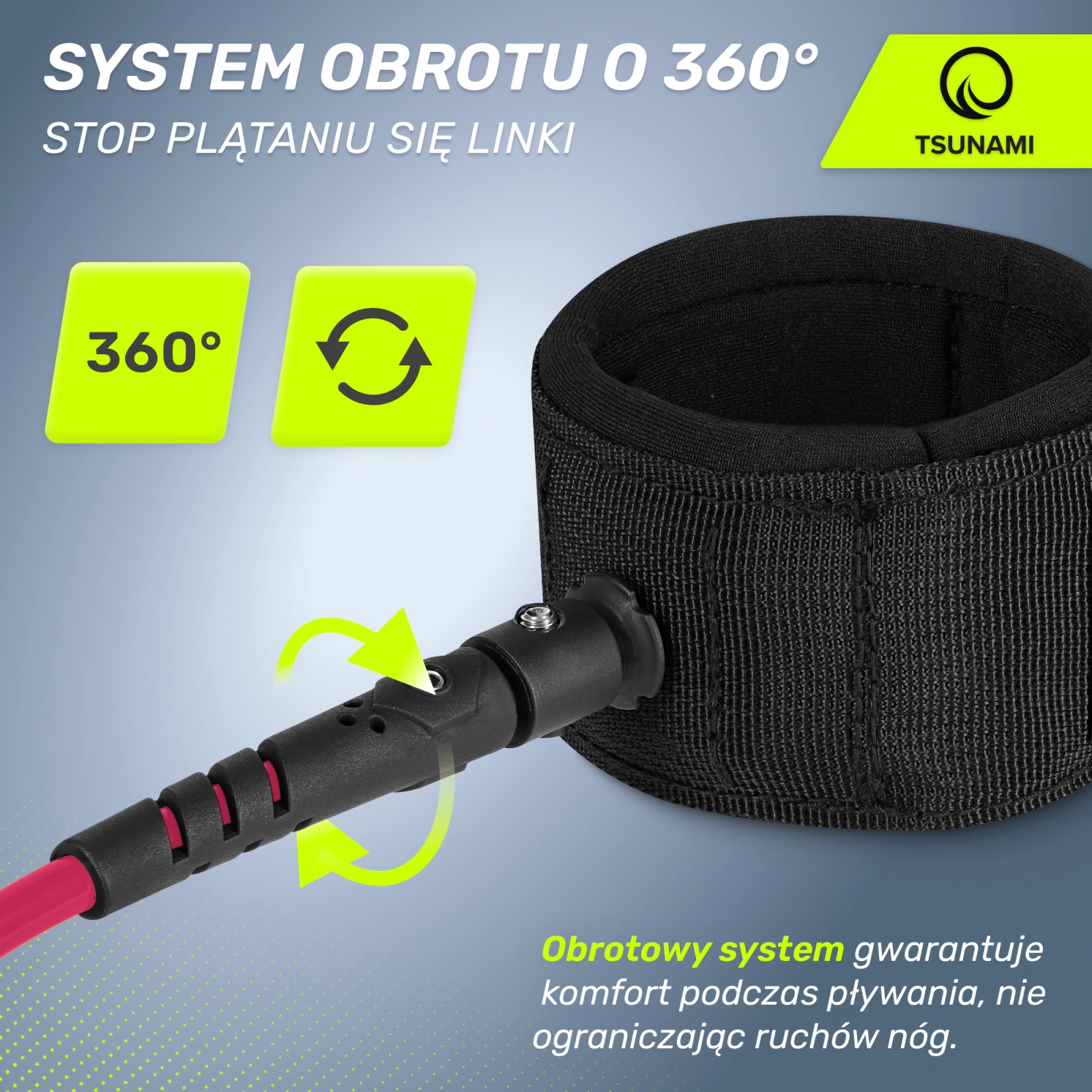 - Długa linka sprężynowa zapewnia maksimum komfortu na desce, ponieważ nie przeszkadza i nie blokuje ruchów nóg podczas pływania.
